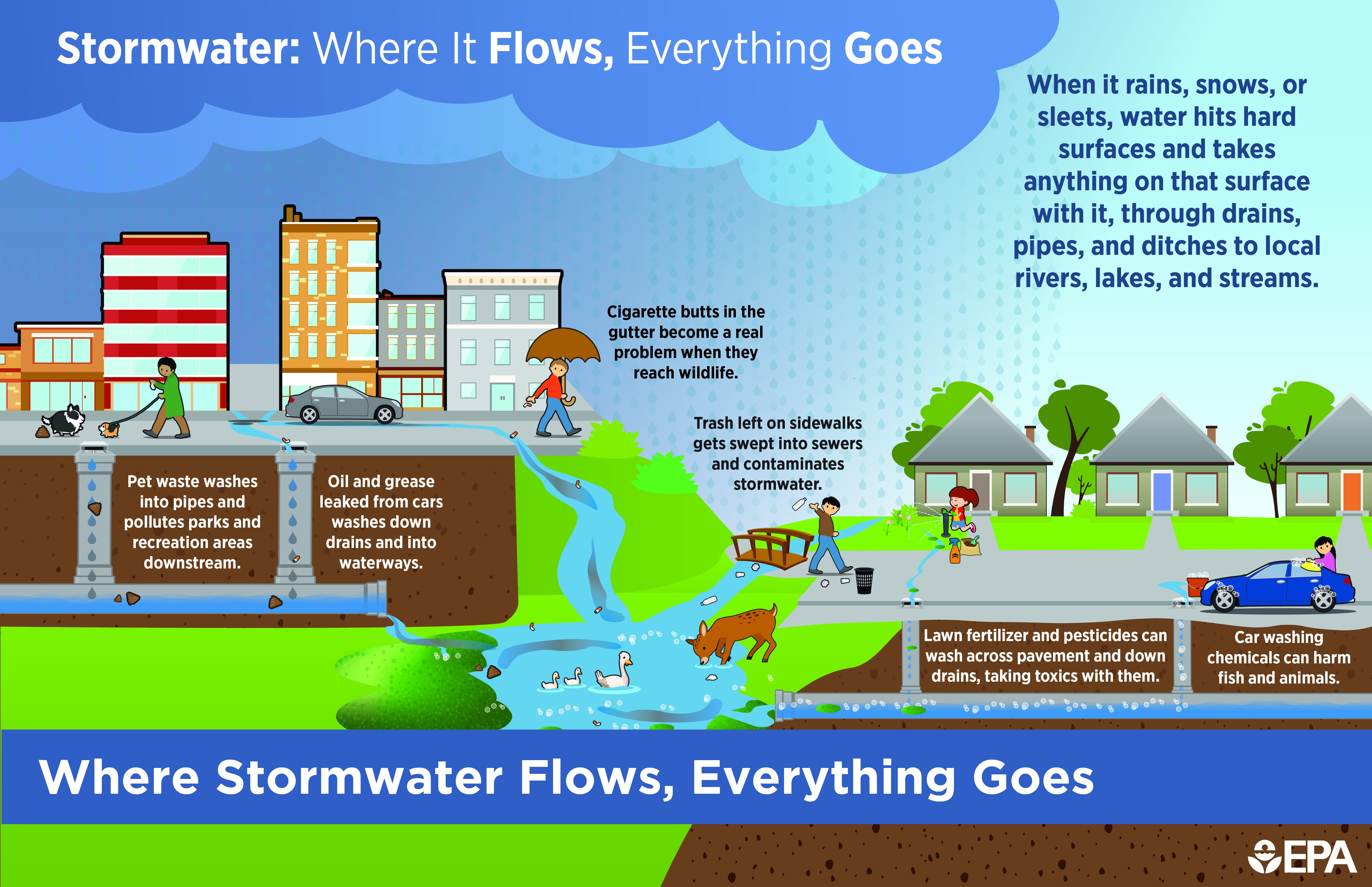 Stormwater is rainwater or snow melt that does not soak into the ground or evaporate following a storm.